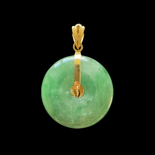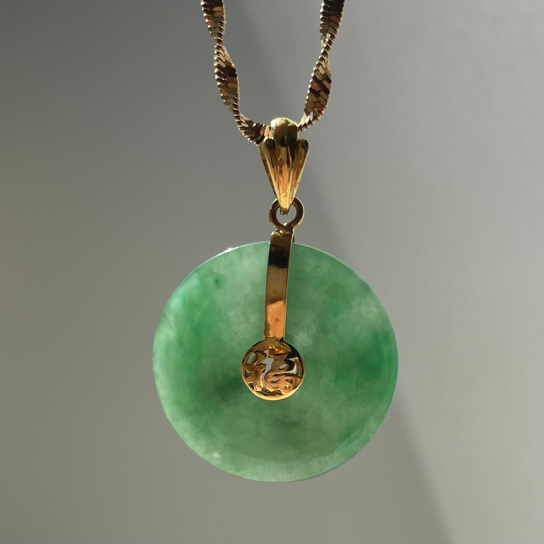 Discover the beauty of our Apple Green Jadeite Jade Pendant. Elegantly designed in a unique 'Donut' shape, set in 10k yellow gold with the Chinese Fu (luck) character in the middle, this pendant is a true representation of timeless elegance and sophistication. Expertly crafted from the highest quality 10K yellow gold, it provides a beautiful contrast with the alluring apple green and light green pattern of the jadeite jade.