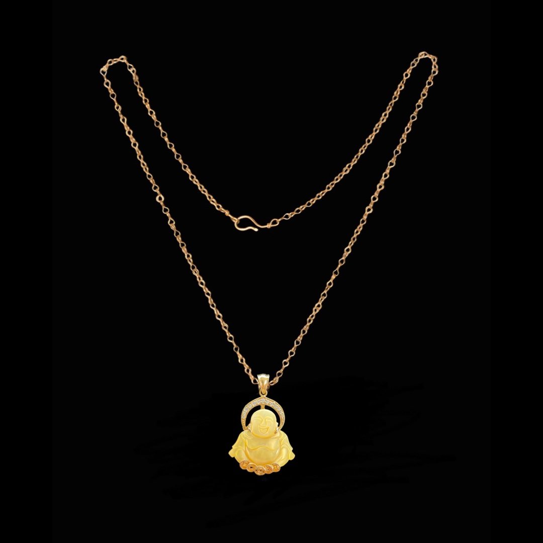 The 'Cha'an Hong Laughing Buddha Pendant' takes inspiration from the traditional laughing Buddha figure that originates from Zhejiang. This iteration portrays Gautama Buddha laughing yet with a peaceful demeanor.