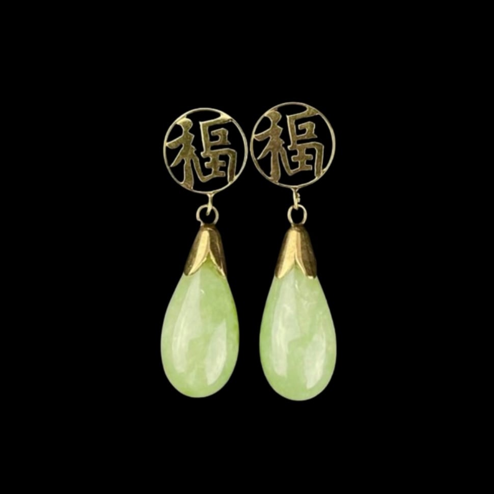 Stunning earrings show a green large teardrop with 10 karat gold tops suspended from a "good fortune" symbol in Chinese letters.